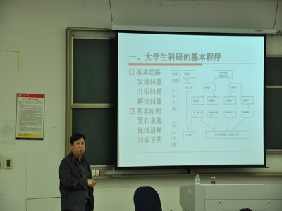 随后,薛誉华教授就科研及科研报告的写作进行了全面的讲解,使同学们脱离了很多认识误区。首先,薛教授提出大学生科研的基本思路为发现问题、分析问题和解决问题,而且在研究过程中应当遵循紧扣主题、脉络清晰和对症下药三个基本原则。接着,他强调大学生科研选题要求新颖,而这恰恰是选题的最大挑战,应当仔细观察,努力寻找敏感点,尽量做到前沿、独特。选题宜小不宜大,宜实不宜空,切忌大包大揽,华而不实,小题目做深才是最好的。尤其不能脱离专业,盲目高端。此外,薛教授认为科研的过程比结果更重要,不能为了科研而科研,进行科研的目的在于提高思维、判断能力。关于科研报告的写作,薛教授为同学们提供了报告的评价标准和基本框架,建议同学们做到视角一致,有理有据。薛教授运用同学们熟悉的事例,将原本枯燥的内容讲得通俗易懂,博得阵阵掌声。