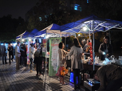 而11日晚上的夜市更使得此次大赛的气氛达到了最高潮,现场音乐不断,灯火通明。经过一天的摆摊,各个队伍吸取前一天的销售经验,增加了人气产品的供应,也纷纷使出各自的杀手锏:手工制作棉花糖、手工奶酪、现场制作关东煮……直到夜市即将结束的时候同学们仍流连在各个摊位中,不愿离开。