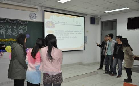 随着主持人出场用流利的英语介绍活动的主题,这次的英语沙龙正式拉开了帷幕,而来自哥斯达黎加的John的一段幽默的开场白使现场的气氛迅速活跃起来。随后播放的关于各国各地春天的节日的短片迅速调动起了大家的兴趣,接下来的游戏“我来描述你来猜”更是将现场的气氛推向了第一个顶点,大家纷纷踊跃参与。随后的“Free Talk”环节大家更是各抒己见,描述自己想要去的地方以及理由。之后,校研究生歌手比赛获奖者,我院的特约嘉宾周蓉蓉同学出场献唱歌曲《someone like you》将全场气氛推向了第二个顶点。现场观众纷纷陶醉在她优美的歌声中,掌声喝彩声不断。随后的劈叉吹蜡烛,单词接龙等游戏同学们都积极参与,乐在其中。各种节日和美食的介绍精彩纷呈,游戏的设计别出心裁,现场的同学争先恐后的参与其中,气氛热烈而温馨。