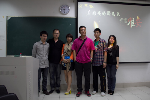 分享会中,方超,姜文翔和刘天芬分别分享了地震期间他们在雅安的工作、志愿服务经历以及在此过程中的一些见闻。方超和姜文翔作为地方媒体人,给大家呈现了当地老百姓的点滴生活和在救灾过程中发生的故事。刘天芬女士作为雅安人,在大灾面前展现了四川人民坚韧不屈的品质。
