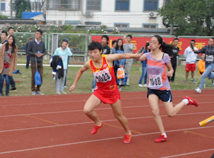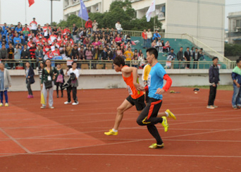 男子接力赛上,来自商院的四名接力运动员依次站在跑道上,发令枪响后,第一棒的选手迅速起跑,将接力棒交到第二棒运动员手中,身着蓝色服装的第二棒运动员瞬间在人群中脱颖而出,成为第一名,这时观众台上的呼喊声更加热烈,看台上的鼓声更加密集。随后,第三棒选手接过接力棒,他毫不松懈,使商院依然保持着第一的位置,接下来是关键的最后一棒。赛前,体育部的部长介绍说,这位运动员的成绩特别优异,大家都拭目以待,最终他第一个冲过终点线。