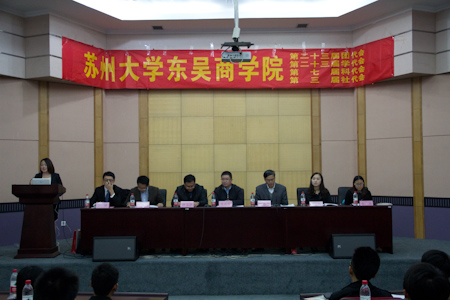 2013年12月4日下午,苏州大学东吴商学院第二十三次团员代表大会、第二十三次学生代表大会、第七次科协代表大会及第三次社联代表大会在财科管学术报告厅隆重召开!此次大会得到了学校、学院领导的高度重视和支持,校团委副书记肖甫青、商学院党委书记陈晓强、党委副书记、副院长唐文跃、团委书记丁良超老师、校学生会主席严祺、校科协副理事长苏畅、校社联临时工作组副组长李琰、以及各兄弟学院(部)代表出席了本次大会。