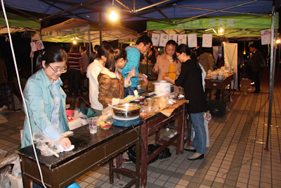 4月9日中午12点,尽管距离决赛开幕还有一个小时,但教超门口早已经是人头攒动。每个队伍都提早进行着准备工作:搬桌椅、布置场地、现做食物等,有些店铺甚至早已在社交网络平台上为自己的店做起了广告。还有一些人则是等待着营销大赛的开始,先观望着哪家店的东西更吸引人。接近下午1点,人又陆续多了起来,大多数都是三五结伴的好友前来。八家小店紧密围绕,每家店的商品又是各具特色。有由来自台湾的同学们组成的“台韩小厨房”贩卖自制的寿司,还有一个名为“六贰B的店”的店铺则是售卖当下正火的炸鸡,还推行送货上门服务,可谓动足了脑筋。还有韩式炒年糕、苏州平江路上的特色鸡爪、布丁等,让不少吃货们饱足了口福。到了晚上,教超门口更是变身为夜市,各个店铺为了招徕生意,纷纷挂起了彩灯、放起了音响,卖力地做着宣传。