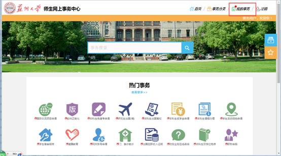 2、通过苏州大学主页,根据您的身份属性选择“教职员工”或“在校学生”进入,点击右侧的“事务中心”进入师生网上事务中心。