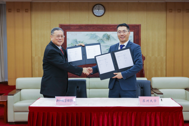 李孝峰对魏国基一行的来访表示欢迎,并介绍了学校的历史和发展情况。他表示,苏州与新加坡有很深的渊源,国际化战略也是苏州大学三大发展战略中重要一环,希望通过此次会见,以两校商学院的合作为起点,建立互信,全面展开与新加坡管理学院的各类合作。