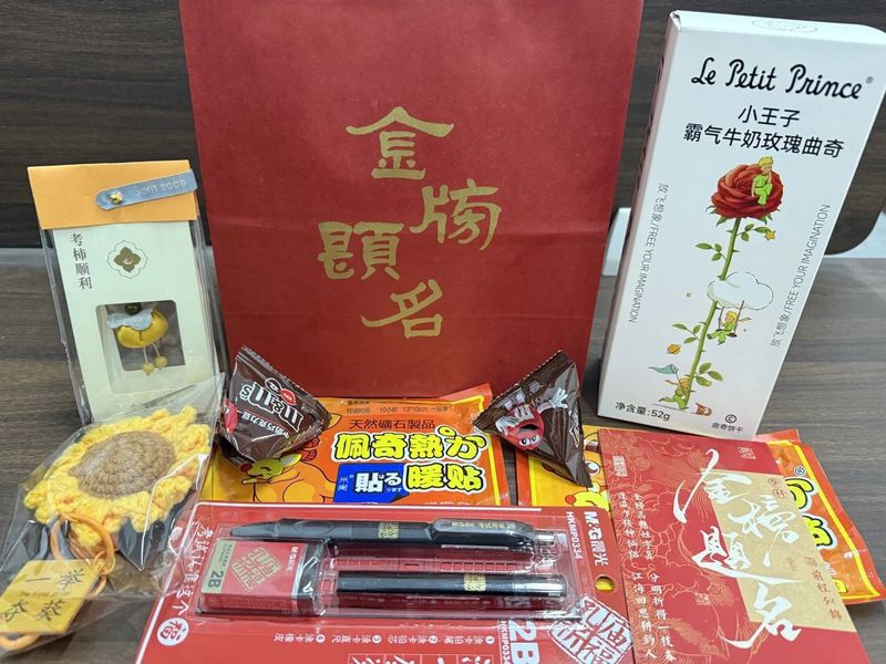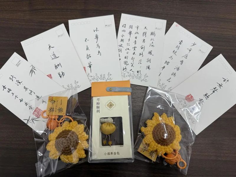 Gifts for Good Fortune, Blessings Filling Hearts. Huang Xiaohui, the Deputy Secretary of the Party Committee and Deputy Dean of the School of Business, inscribed the words Top the List for the students preparing for the postgraduate entrance examination and carefully prepared gift bags. The gifts also carried the meanings of wonderful writing, ingeniously overcoming difficulties, smooth exams, and winning with one stroke, symbolized by the Chinese characters for pen, clever, persimmon, and sunflower respectively. These small gifts express abundant blessings, and every ingenious thought represents the love and care of the college for the students preparing for the exams.
