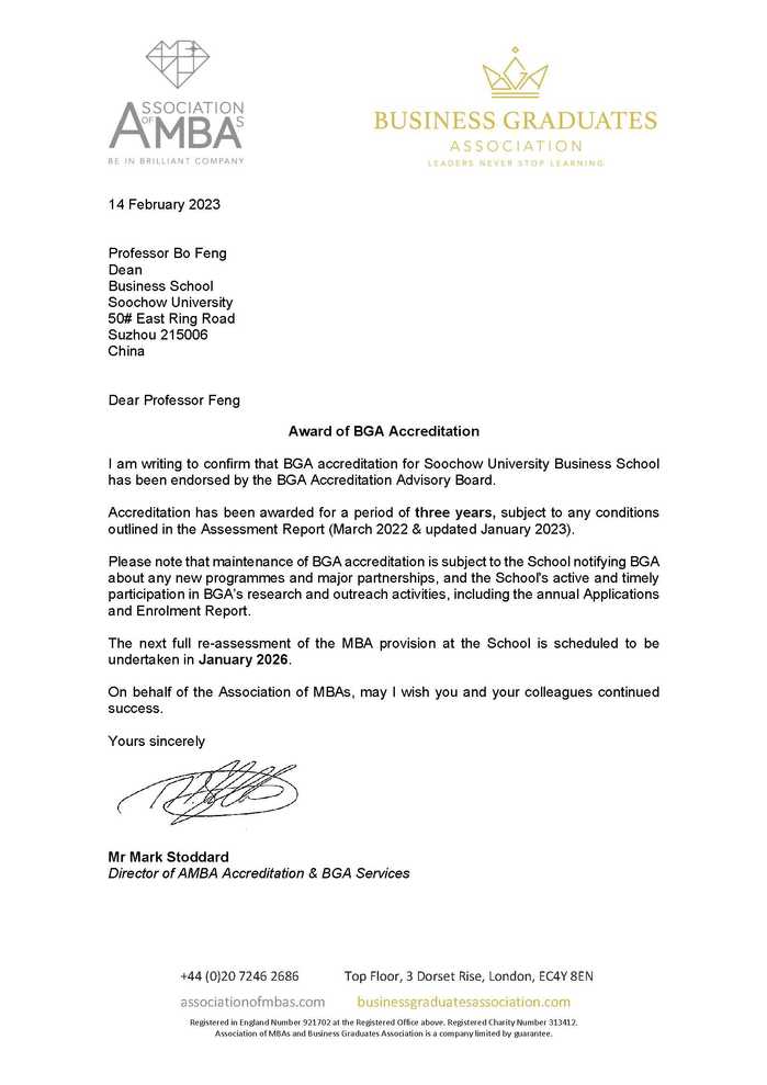 The Business School of Soochow University has received the confirmation from the Association of MBAs (AMBA) and Business Graduates Association (BGA) with the Award of BGA Accreditation, 15 February 2023.