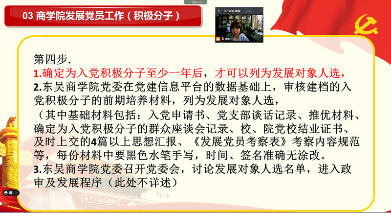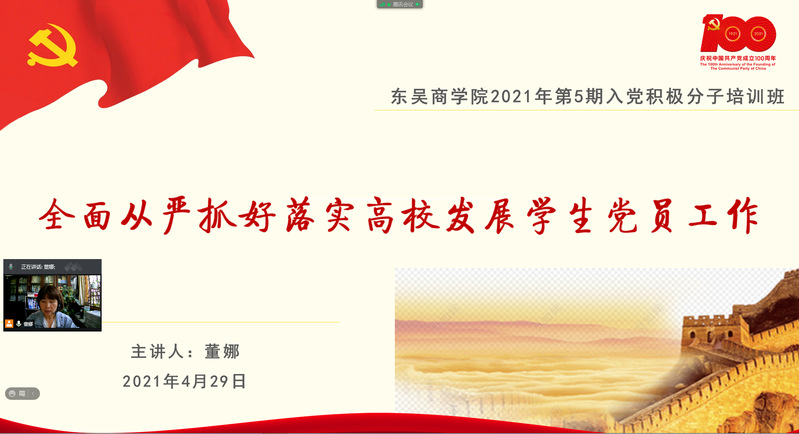 4月29日中午,东吴商学院2021年春季分党校第5期入党积极分子培训班组织线上专题党课,本次党课由院党委副书记、分党校副校长董娜老师主讲,106名入党积极分子参加本次课程。