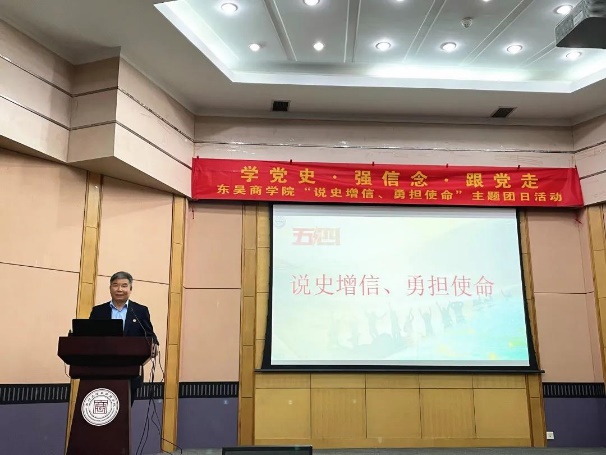 为进一步坚定青年学生不忘初心、牢记使命的决心和信仰,激励同学们从历史文化中获得启迪、从学理脉络中增强自信,2021年5月4日上午9点30分,苏州大学东吴商学院在财经科学馆二楼学术报告厅举办了以“说史增信 勇担使命”为主题的团日活动。苏州大学党委副书记王鲁沛老师,校团委书记于潜驰老师,东吴商学院党委书记刘志明老师,院长冯博老师,商学院首届本科生、原院长王则斌老师,学院副院长王要玉老师、徐涛老师,纪委委员马龙剑老师,孙俊芳老师,全体辅导员老师以及各团学组织的学生干部们出席了此次活动。活动由季存森老师主持。