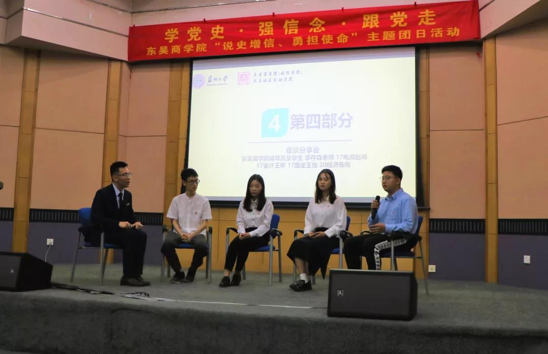 在由季存森老师主持的优秀团员及青年学生座谈分享会环节中,四位来自东吴商学院的优秀学子结合自己的实际情况,从不同的角度与大家分享了成长心路,展现了当代学院青年学子崇高的理想信念和精神追求。