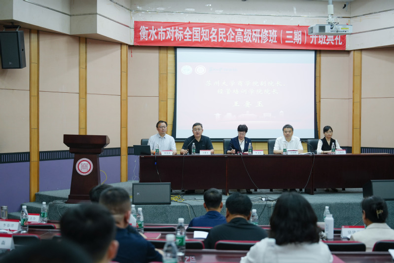 开班仪式由衡水市委统战部副部长、市工商联党组书记姜丙刚主持,衡水市委常委、统战部部长申文霞,苏州大学商学院副院长、经管培训学院院长王要玉,经管培训学院副院长缪爱国,经管培训学院企业定制培训中心主任王丹萍出席。