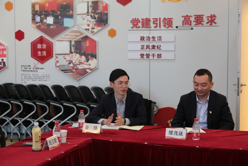 为了深入学习党的十九届五中全会精神,完成好学院党委的“书记项目”,2020年11月30日,东吴商学院党委副书记兼副院长董娜一行人赴招商银行苏州分行开展党建共建活动,学院党委专职纪检委员马龙剑、专职组织员缪爱国以及本科生、研究生党支部书记、学生党员代表参加活动。招商银行苏州分行副行长侯登峰、消保中心总经理陆勤霞、人力资源部总经理赵丽宁、中新支行行长助理缪茂晟、战略客户部客户经理金锋(商学院18届市场营销专业本科生)、营业部柜员陈宇飞(商学院19届会计专业本科生)参与了交流。