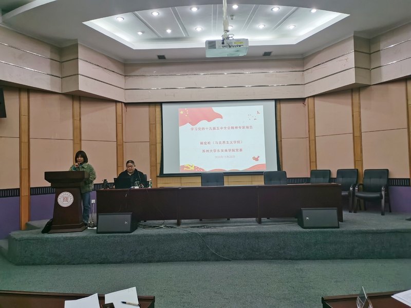 2020年11月25日下午,东吴商学院党的十九届五中全会精神宣讲会在苏州大学东区财科馆二楼学术报告厅举行。苏州大学马克思主义学院顾宏松老师作《擘画新蓝图,开启新征程——党的十九届五中全会精神解读》主题报告。东吴商学院党委书记刘志明主持,院党委副书记、副院长董娜,党委专职组织员缪爱国、师生党员代表、院分党校2020年秋季培训班学员参与听讲。
