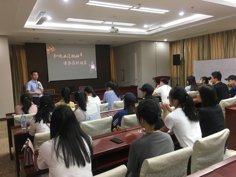 在播放了一段苏绣视频后,体验馆的周华老师为同学讲授“弘扬工匠精神,传承苏绣技艺”主题讲座,内容从苏绣作品赏析、苏绣历史文化、认知刺绣材料和工具、并将苏绣特点“平、齐、细、密、和、光、顺、匀”融入匠心:“安静、安宁,专注,努力向极致再近一点、更近一点。”