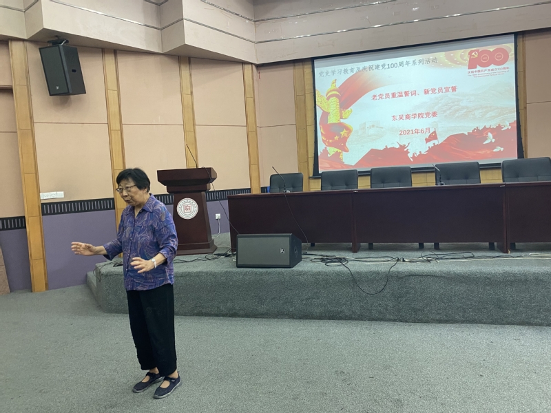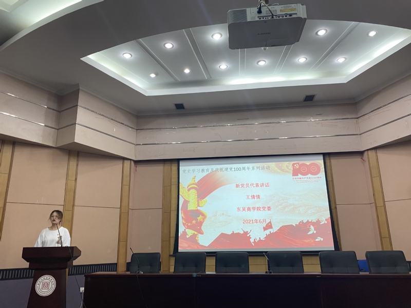 东吴商学院研究生王倩倩作为新党员代表发言,表示在组织上入了党,更要在思想上入党,要以老党员们为榜样,做到始终听党话,跟党走,把对马克思主义的信仰,对中国特色社会主义的信念,对实现中华民族伟大复兴中国梦的信心,融入到平常学习生活中,做到初心如磐,使命在肩,把青春融入到这个伟大的时代,做出新时代青年大学生应有的贡献。