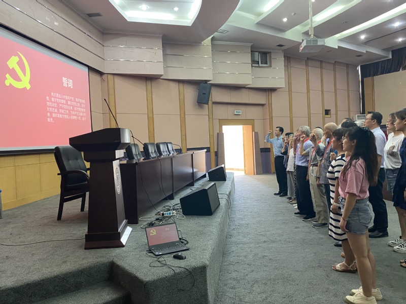 合唱完毕,党委书记刘志明带领新老党员宣誓。大家庄严地面向党旗,高举右拳,郑重宣誓,铿锵有力的宣誓声响彻会场。