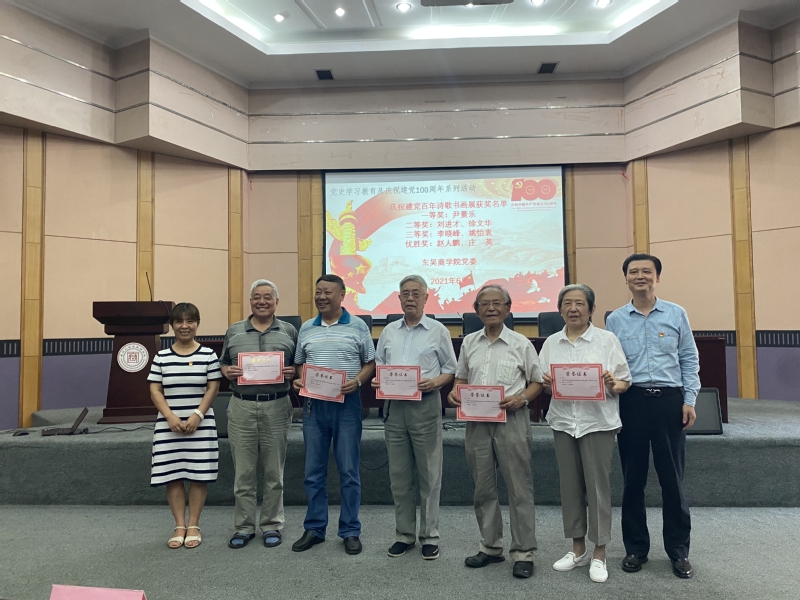 党委副书记董娜公布了庆祝建党百年商学院老同志书画诗歌展获奖名单并为获奖同志颁布奖状。老党员黄文珠老师带领大家合唱《没有共产党就没有新中国》,歌声中充满了对党的热爱与尊敬。