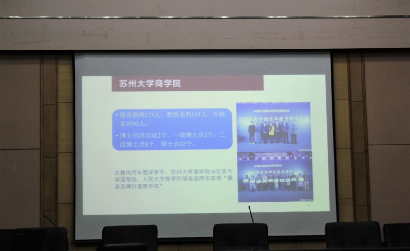 接下来,冯院长向我们着重介绍了东吴商学院的科学研究及工作思路。近年来学院共承担国家、省、市各级科研课题300多项;获批国家级科研项目数连续两年位列学校文科学院第1位;学院纵向和横向科研经费到账650万元;获得各类科研奖励180多项;撰写出版专著250余部;发表学术论文1200多篇;在MISQ、JOM、JMIS、 DS、TRB等国际A类期刊发表论文20余篇;学院在2017中国大学专利获奖排行榜第17位。接着,院长又从博士点、硕士点的设置及东吴商学院教授名录方面,使我们对苏州大学研究生招生工作有了较为客观的了解。