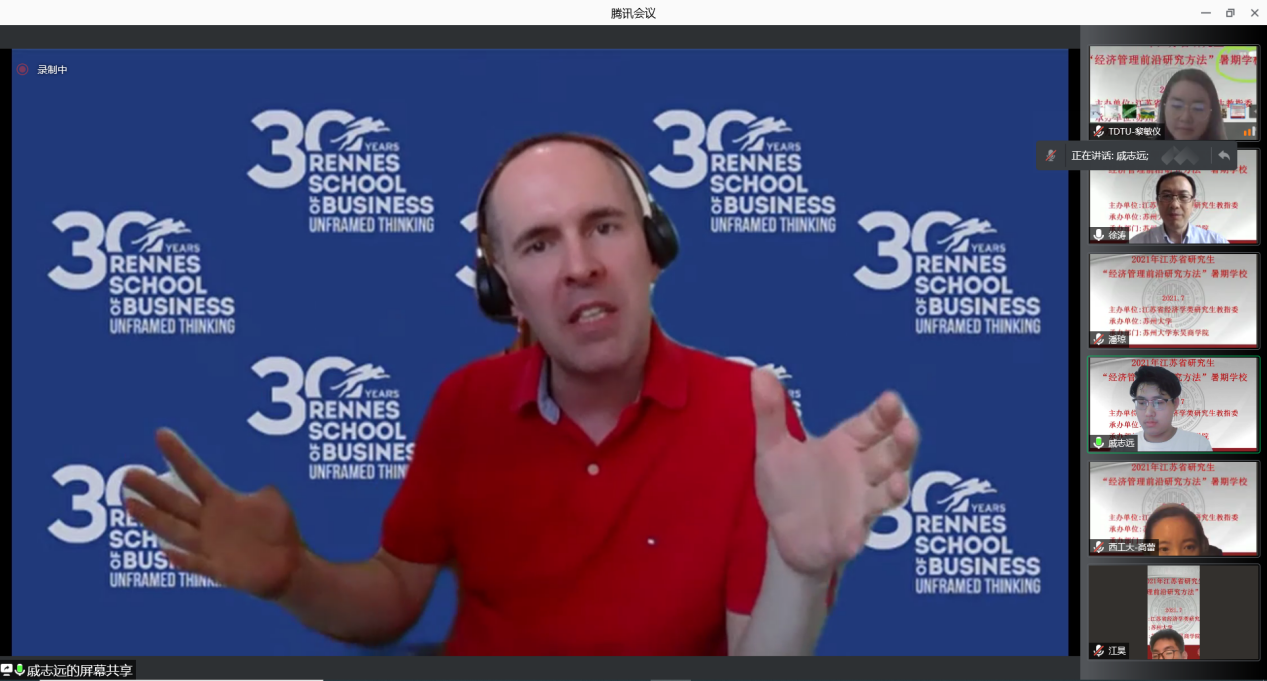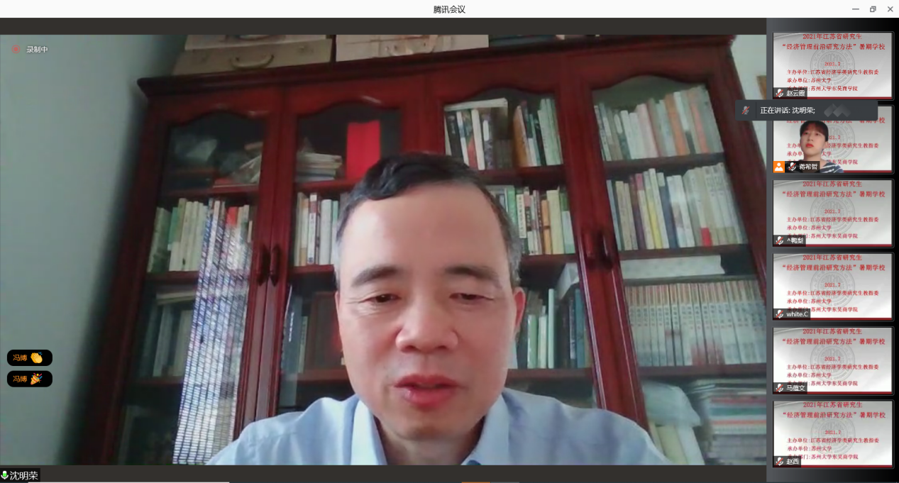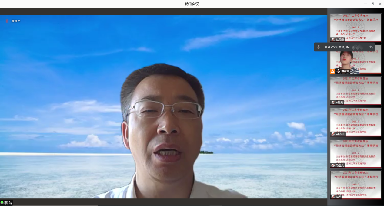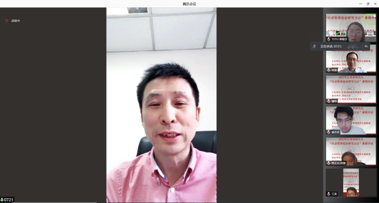 江苏省经济学类研究生教育指导委员会副主任委员裴育教授宣布2021年江苏省研究生“经济管理前沿研究方法”暑期学校正式开班并致辞。裴育教授指出,为深入贯彻落实习近平总书记关于研究生教育工作的重要指示精神,扎实推进研究生的创新能力和学术水平,特此开展此次教授水平高、课程内容前沿性强的暑期学校。今年正值中国共产党成立100周年,也是我国“两个一百年”的交汇点,希望同学们珍惜机会,刻苦学习,掌握前沿的研究方法,努力提高学术水平。