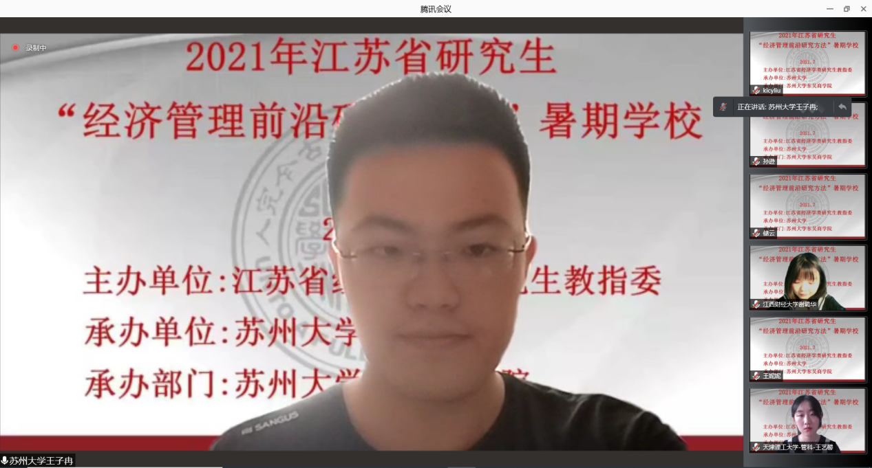 为了促进高校优秀研究生之间的学术交流,充分利用研究生教育的优质资源,推动中国经济管理学科研究的国际化、现代化以及现代经济管理研究的中国化,2021年7月21日上午8时30分,由江苏省经济学类研究生教育指导委员会主办,苏州大学东吴商学院承办的2021年“经济管理类前沿研究方法”研究生暑期学校开班典礼顺利举行,本次会议采用远程线上形式。江苏省经济学类研究生教育指导委员会副主任委员、南京审计大学副校长裴育教授、苏州大学副校长沈明荣教授、江苏省经济学类研究生教指委秘书长、南京财经大学金融学院院长张成教授、苏州大学研究生院院长曹健教授、苏州大学东吴商学院院长冯博教授、美国新墨西哥大学罗欣教授、澳大利亚麦考瑞大学石劲教授出席本次开班典礼。江苏省经济学类研究生教指委委员、苏州大学东吴商学院副院长徐涛教授主持本次开班典礼。