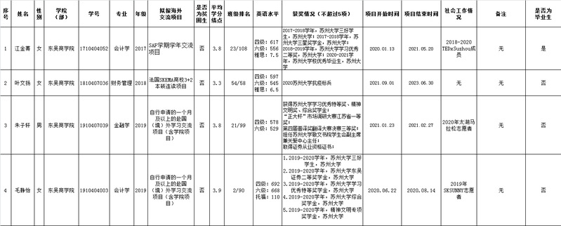东吴商学院2020年与2021年苏州大学本科生出国(境)交流经费资助申请初审名单公示