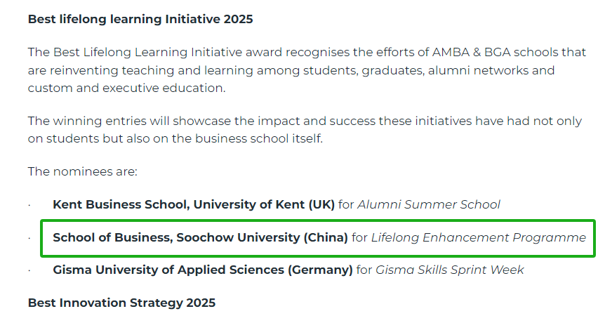 近日,英国工商管理硕士协会(AMBA)和商学院毕业生协会(BGA)发布了2025年AMBA和BGA全球商科卓越奖获奖名单。苏州大学商学院在此次评选中荣获“最佳终身学习举措奖”铜奖,...