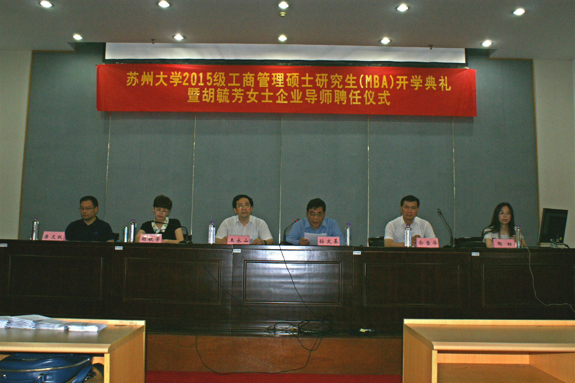 2015年9月19日上午,苏州大学东吴商学院2015秋季MBA开学典礼在本部图书馆学术报告厅隆重举行。东吴商学院党委书记王永山、主持工作副院长孙文基、苏州太湖雪丝绸有限公司董事长胡毓芳,副书记、副院长唐文跃、MBA中心主任俞雪华、MBA办公室主任陶虹,以及MBA中心工作人员、老生代表和近200名MBA新生出席。开学典礼在庄严的国歌声中拉开帷幕。