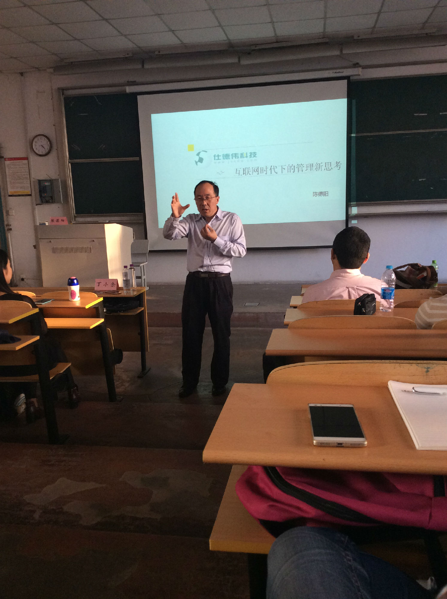 ?xml:namespace> 10月17日下午,在同学们的热烈掌声中,江苏仕德伟集团总经理陈德阳先生来到我院东吴MBA大讲堂,为我院MBA学员作了一场题为“互联网时代下的管理新思考”的报告。讲座由东吴商学院魏文斌教授主持,2015秋季MBA班全体同学和部分其他班级同学一起参加了本次讲座。 陈德阳先生不仅在行业内成就卓越、遐迩闻名,担任苏州电子商务协会会长、苏州软件行业协会理事长、苏州中小企业协会副会长、苏州现代电子业商会副会长、苏州高新区文化创意商会副会长和中国电子商务协会网络营销专委会委员等多份职务,曾获首届“江苏省互联网十年发展推动人物”、“江苏互联网(二十年)十大创新领军人物”和“江苏省用户满意单位卓越领导者”的荣誉称号,而且学识丰富,善于总结多年来的实践工作,并乐于分享自己的经验成果,担任苏州大学东吴商学院MBA的企业导师。 讲座开始,陈先生以现实生活事件为切入点生动幽默地讲解了互联网对我们日常生活的影响,从频繁的网上购物、明星演唱会售票抢票事件、餐饮娱乐类的团购经历到电商巨头间的纷争博弈,各种举证信手拈来,视角新颖,语言活泼,引得同学笑声不断、掌声不断。接着陈先生向MBA同学们就如何在快速变化的互联网时代转变管理思维理念以适应时代的发展提出了三点建议:一是要对互联网时代有深刻的、本质的认识,二是要能熟练使用互联网时代的工具并进行创新性推进,三是要利用互联网对经营模式、组织结构和运营方式等进行改进直至颠覆,陈先生以自己在这几方面的所得所思所做所得向同学们传授切身经验。其后陈先生详细介绍了仕伟德公司独特的微信文化,包括对员工微信设置的统一要求、充分利用微信这一及时沟通工具的具体措施和利用微信红包激励员工的新奇方法等内容。最后,魏文彬教授对本次专题讲座进行了总结发言,并代表东吴商学院和2015秋季MBA班全体同学向陈德阳先生在百忙之中抽空前来分享知识和经验表示真挚的感谢。
