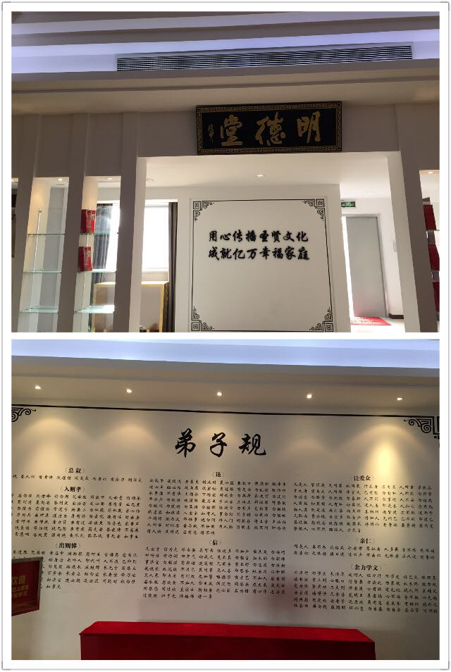 在参观完旭日装饰的整体情况以后,我们进入了本次参观的正题,旭日装饰的核心文化之地——明德堂。早就对旭日的非常文化有所耳闻,但是真正进入明德堂的时候还是很震撼的。正堂就最显眼的位置就是企业的愿景,用心传播圣贤文化,成就亿万幸福家庭,更有一整面墙的弟子规(据说每位旭日的员工都会被背诵弟子规),这已经成为植入员工心中的一个道德思想准绳。旭日在培养人才时,也是对人才的品德观(百善孝为先,尊重他人),家庭责任观(会经营家庭),敬业观(认真工作),习惯观(习惯决定命运),积淀观(磨难是成功必修课)十分注重。