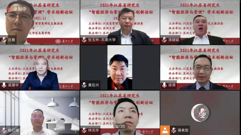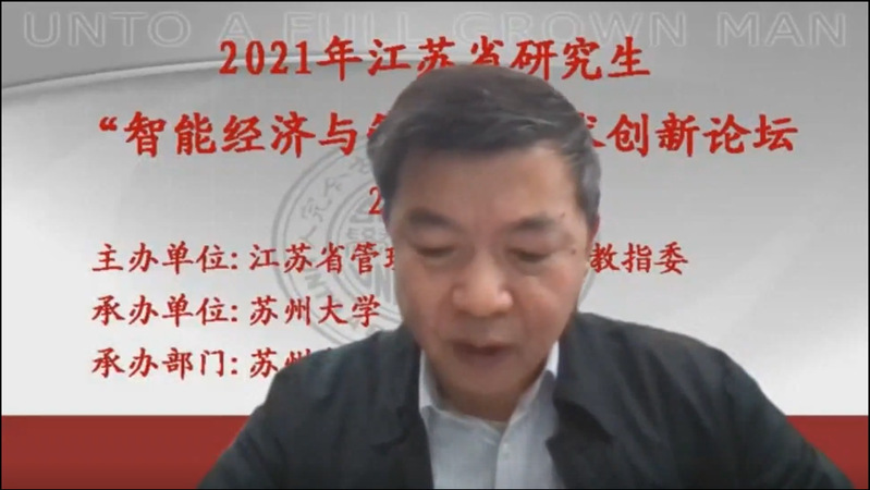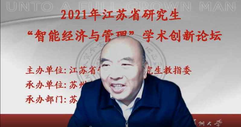 2021年11月6日,由江苏省管理学类研究生教育指导委员会主办,苏州大学东吴商学院承办的2021年江苏省研究生“智能经济与管理”学术创新论坛成功举办。受疫情影响,此次论坛采用网络连线的方式举行。来自全国20多所高校的专家学者与企业代表参加了本次学术创新论坛,共同研讨“智能经济与管理”领域前沿问题。论坛开幕式由我校东吴商学院副院长徐涛教授主持。