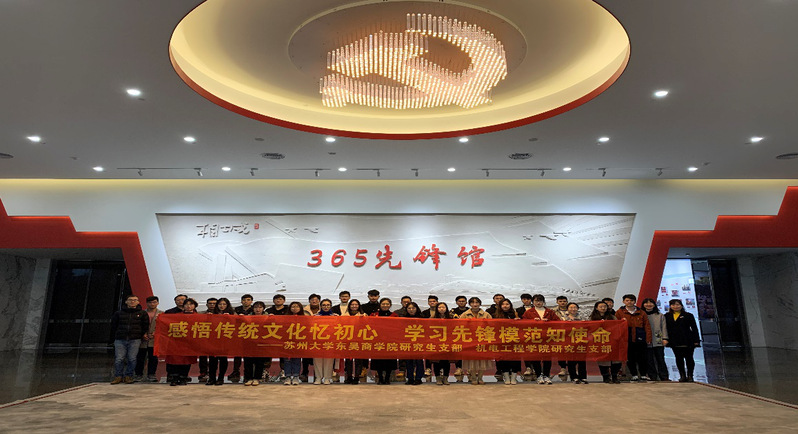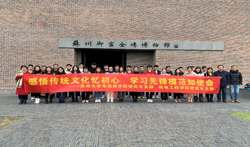 为学习习近平新时代中国特色社会主义思想,感悟“不忘初心、牢记使命”的深刻内涵,2019年11月29日,在苏州大学东吴商学院缪爱国老师、沈炜策老师;苏州大学机电工程学院沈爱军老师、金子祺老师的带领下,苏州大学东吴商学院研究生党支部和机电工程学院研究生党支部开展“感悟传统文化忆初心,学习先锋模范知使命”联合党日活动。