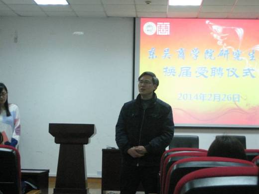 2014年东吴商学院研究生会换届受聘仪式于2月26日下午四点,在财经科学馆105准时开始,东吴商学院党委书记陈晓强老师、东吴商学院研究生工作助理宋辉老师以及全体研会成员出席了本次换届受聘仪式。东吴商学院研究生会主席杨慧同学主持了本次仪式。