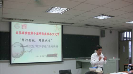 2014年5月21日晚6点半,“擎灯引航,辟径成才”——东吴商学院研究生“职来职往”系列讲座在文成楼301教室准时举行。此次讲座由东吴证券股份有限公司和东吴商学院研究生会联合举办,旨在让研究生了解就业行情,能够从自身实际角度出发,合理的择业就业。本次讲座很荣幸邀请到了东吴证券股份有限公司园区现代大道营业部副经理赵旗荣先生作为主讲嘉宾。