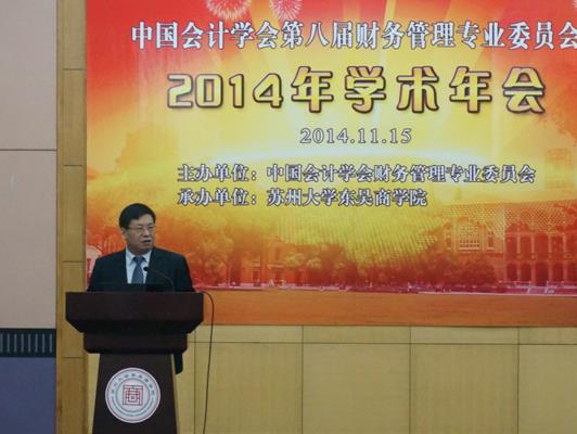 11月15日上午8:40,由中国会计学会财务管理专业委员会主办,我校东吴商学院承办的中国会计学会第八届财务管理专业委员会2014年学术年会在东校区财经科学馆召开。中国会计学会副会长、财务管理专业委员会主任、西南财经大学党委书记赵德武,北京大学光华管理学院副院长陆正飞,南京大学教授李心合,四川大学教授干胜道,对外经济贸易大学教授汤谷良,我校党委委员、副校长陈一星,东吴商学院院长王则斌,以及来自全国26所高校、部分科研院所和企事业单位的50余名代表,第八届财务管理专业委员会委员等参加了此次学术年会。会议开幕式由中国会计学会副会长、财务管理专业委员会主任赵德武主持。我院2014级全体研究生出席旁听了本次会计年会。