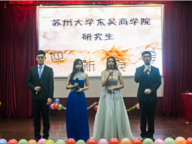 东吴商学院2015年研究生迎新晚会于11月3日晚6:30,在苏州大学本部学术报告厅隆重举行。东吴商学院领导、老师以及2015级全体研究生共聚一堂,热烈欢迎2015级研究生新同学的到来。本次活动由东吴商学院研究生会主办,出席晚会的嘉宾分别是苏州大学东吴商学院党委书记王永山老师、苏州大学东吴商学院院长孙文基老师、苏州大学东吴商学院党委副书记副院长唐文跃老师、苏州大学东吴商学院党委干事缪爱国老师、苏州大学东吴商学院研究生学生工作助理宋辉老师。