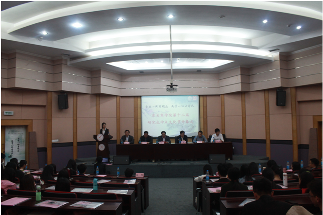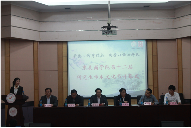 学如弓弩,才如箭簇,识以领之,方能中鹄。2016年4月13日晚6:30,东吴商学院第十二届研究生学术文化节在天赐庄校区财经科学馆二楼学术报告厅盛大开幕。苏州大学党委研究生工作部部长宁正法老师、苏州大学研究生教育管理科科长严明老师、苏州大学东吴商学院党委书记王永山老师、东吴商学院党委副书记、副院长唐文跃老师、东吴商学院党委干事缪爱国老师,东吴商学院研究生工作助理宋辉老师、苏州大学研究生会主席卢明哲同学、苏州大学研究生会主席团成员,以及东吴商学院本科学生组织负责人应邀出席了此次开幕式。本次开幕式由东吴商学院研究生会主席苏琳茹同学主持。东吴商学院研一、研二同学出席了本次活动。