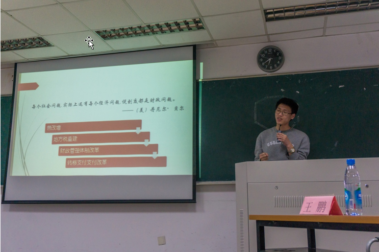 王鹏同学主要就“营改增”的相关政策进行了解读与评析。首先,他对“营改增”的含义进行了简单介绍;紧接着,他对“营改增”的原因与政策意义所在进行分析,他认为,“营改增”政策实施后有助于减少重复征税问题、有利于扩大行业分工以及有效避免税收流失;随后,王鹏同学对“营改增”的发展历程与具体内容进行介绍,具体内容包括纳税人、征税范围、税率、征收率、应纳税额等;最后,王鹏同学就“营改增”政策实施后的影响进行分析。