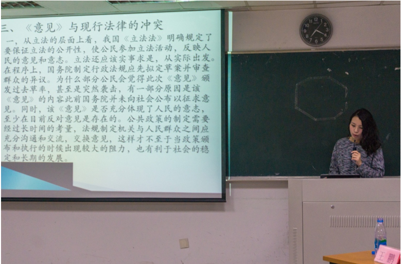 刘晓惠同学则就开放小区的正当性进行论证,由“新建住宅小区为何要实行街区制?”“住宅小区打开后,人身财产安全如何保障?”“对于本来属于全体业主共同所有的道路,开放之后成为公共道路,国家是否要予以补偿?”等问题通过前后对比以及援引法律条文的方式一一进行论证。