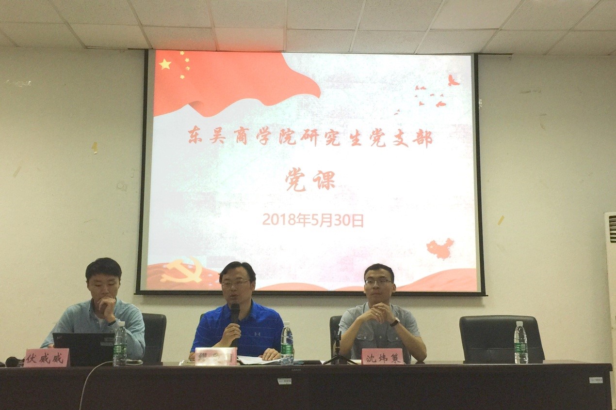 2018年5月30日下午三点,苏州大学东吴商学院研究生会干部大会暨东吴商学院研究生党支部党课在财经科学馆105顺利举行。东吴商学院党委干事缪爱国老师,研究生辅导员沈炜策老师,院研究生会全体成员以及入党积极分子出席了本次会议。