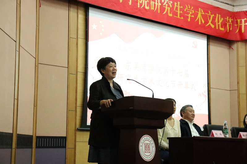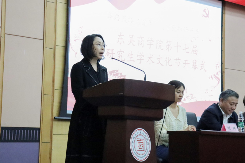 随后,苏州大学党委研究生工作部吴雪梅老师致辞。吴老师充分肯定了东吴商学院的发展,认为我院在学校的学科发展过程中起到了带头作用,同时对所有做出奉献和工作的老师、同学表达了感谢。吴雪梅老师还简单回顾了中国共产党的百年奋斗史,从而希望同学们传承党的血脉精神,将百年未有之大变局转变成为“大机遇”。最后,吴老师以本次活动为契机,对研究生会以及广大同学提出三点要求:希望研究生会做好师生之间的纽带,发挥带头作用;同时希望同学们能够积极参与校园活动,利用好学习提供的舞台,立鸿鹄之志,抓住百年未有之大机遇。