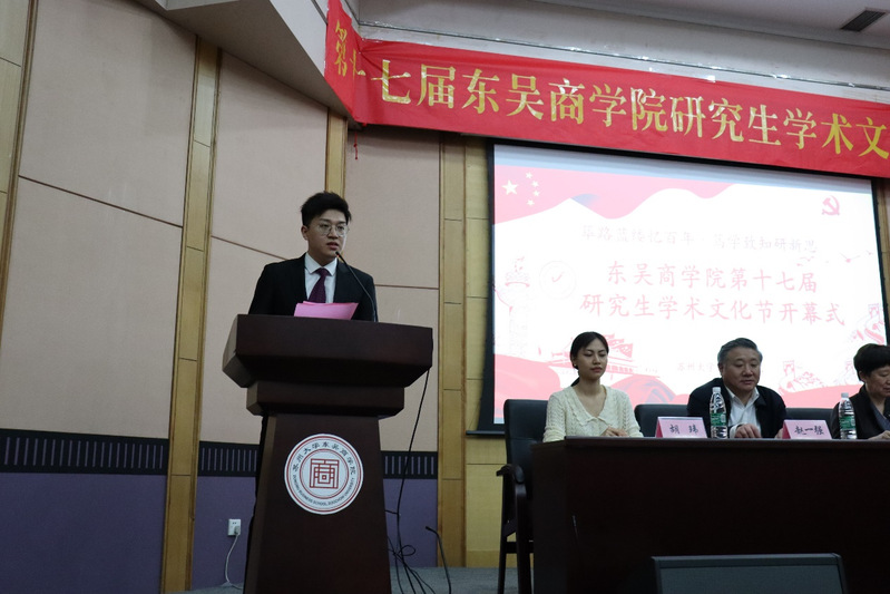 嘉宾致辞结束,陶翰林宣布东吴商学院第十七届学术文化节正式开幕。接着,他向大家介绍了本届学术文化节的主要内容:本次学术文化节的活动紧紧围绕“筚路蓝缕忆百年,笃学致知研新思”的主题,分为两个系列。系列一“筚路蓝缕,和衷共济”的活动包括党史配音大赛、微党课大赛、党史知识竞赛、党史书画比赛、党史演讲比赛等。系列二“笃学致知,躬行实践”包括读书分享会、本硕博学术交流会、趣味徒步活动、羽毛球比赛、党史、抗议明信片设计等活动。同学们可以通过丰富多彩的活动,进一步感受百年大党的力量,大力发扬红色传统、传承红色基因,鼓起迈进新征程、奋进新时代的精气神。