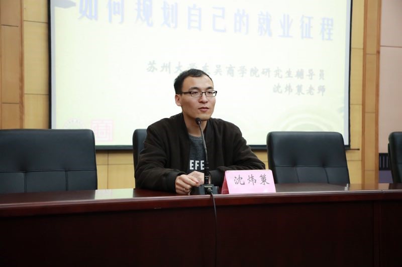 开幕仪式结束后,东吴商学院研究生辅导员沈炜策老师,为参会同学带来一场题为“如何规划自己的就业征程”职业规划讲座。沈炜策老师有着较为丰富的职业经历,他结合自己回国后的求职经验,详细地讲述了四大、可口可乐、宝洁等知名事务所和外企的面试过程,向广大研究生同学传授与面试相关的技巧和经验。沈老师指出,职业选择的迷茫源于自身认知的模糊,告诫各位同学在求职时一定要结合自身能力,找准职业定位,确定发展方向,合适的才是最好的。