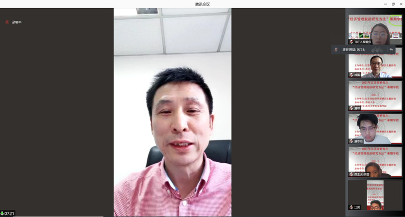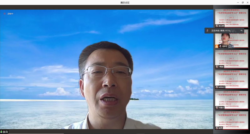 江苏省经济学类研究生教育指导委员会副主任委员裴育教授宣布2021年江苏省研究生“经济管理前沿研究方法”暑期学校正式开班并致辞。裴育教授指出,为深入贯彻落实习近平总书记关于研究生教育工作的重要指示精神,扎实推进研究生的创新能力和学术水平,特此开展此次教授水平高、课程内容前沿性强的暑期学校。今年正值中国共产党建党100周年,也是我国“两个一百年”的交汇点,希望同学们珍惜机会,刻苦学习,掌握前沿的研究方法,努力提高学术水平。